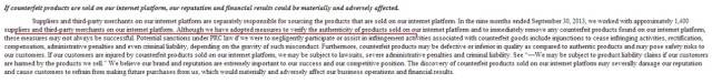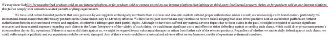在风险因素里,他说随着第三方商家数量增多,很难确保它们提供的服务是否能满足用户,如果它们卖次品、卖假货或是非授权商品,公司可能面临索赔。